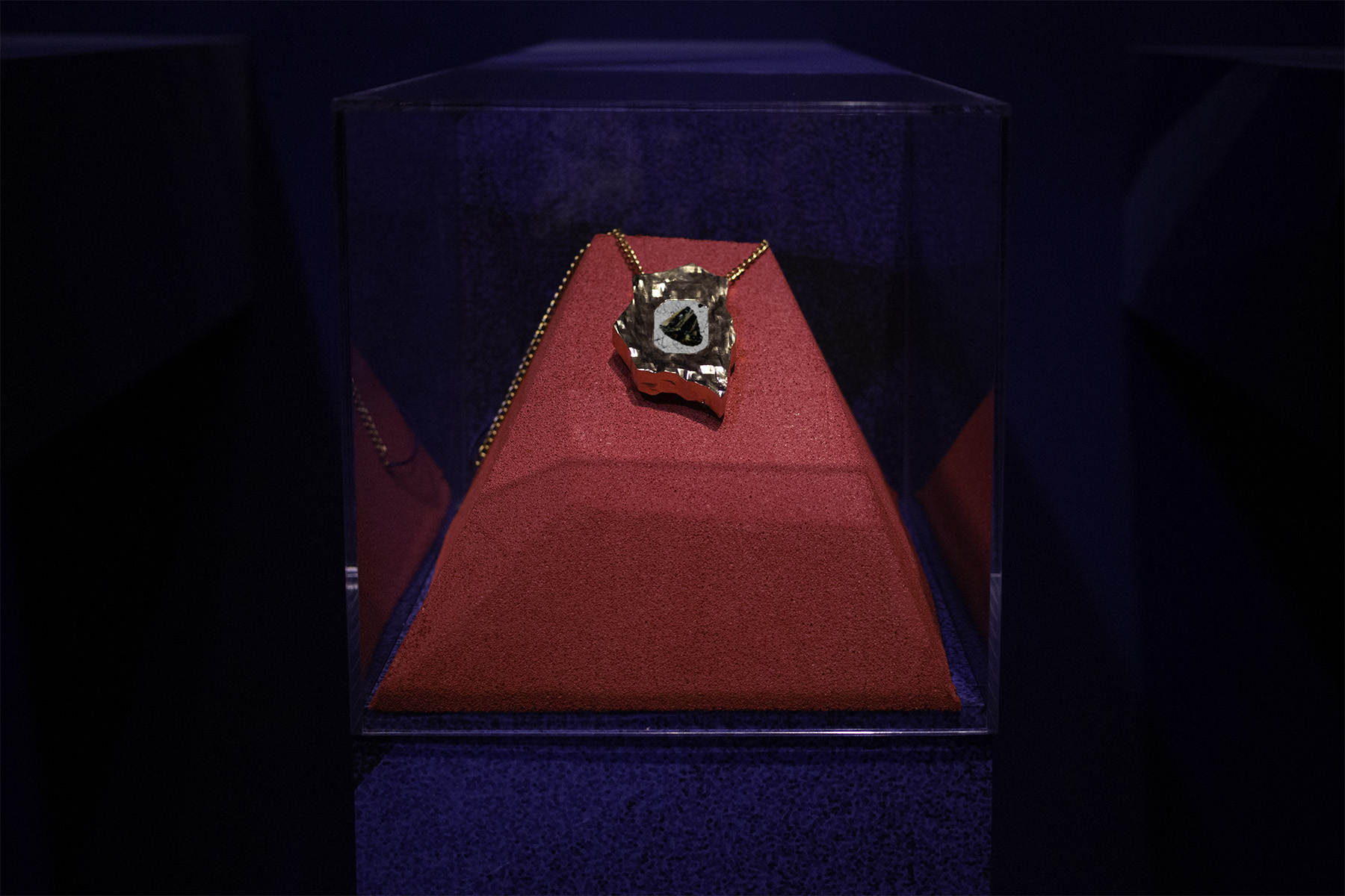 Brass, polymer, custom software, battery-operated custom microcontrollers, vitrines, pigment print on paper, painted foam, plexiglass