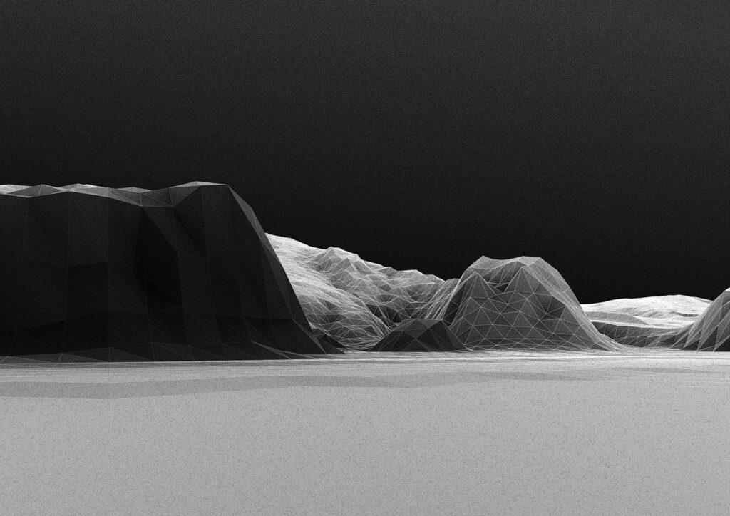 The videos feature large, volcanic rocks collected from various film sites (basalt, pumice, obsidian) that were laser scanned to create photorealistic 3D models. The models oscillate against a backdrop of flashing cross-section micrographs of stones and meteorites from geological collections around the world.